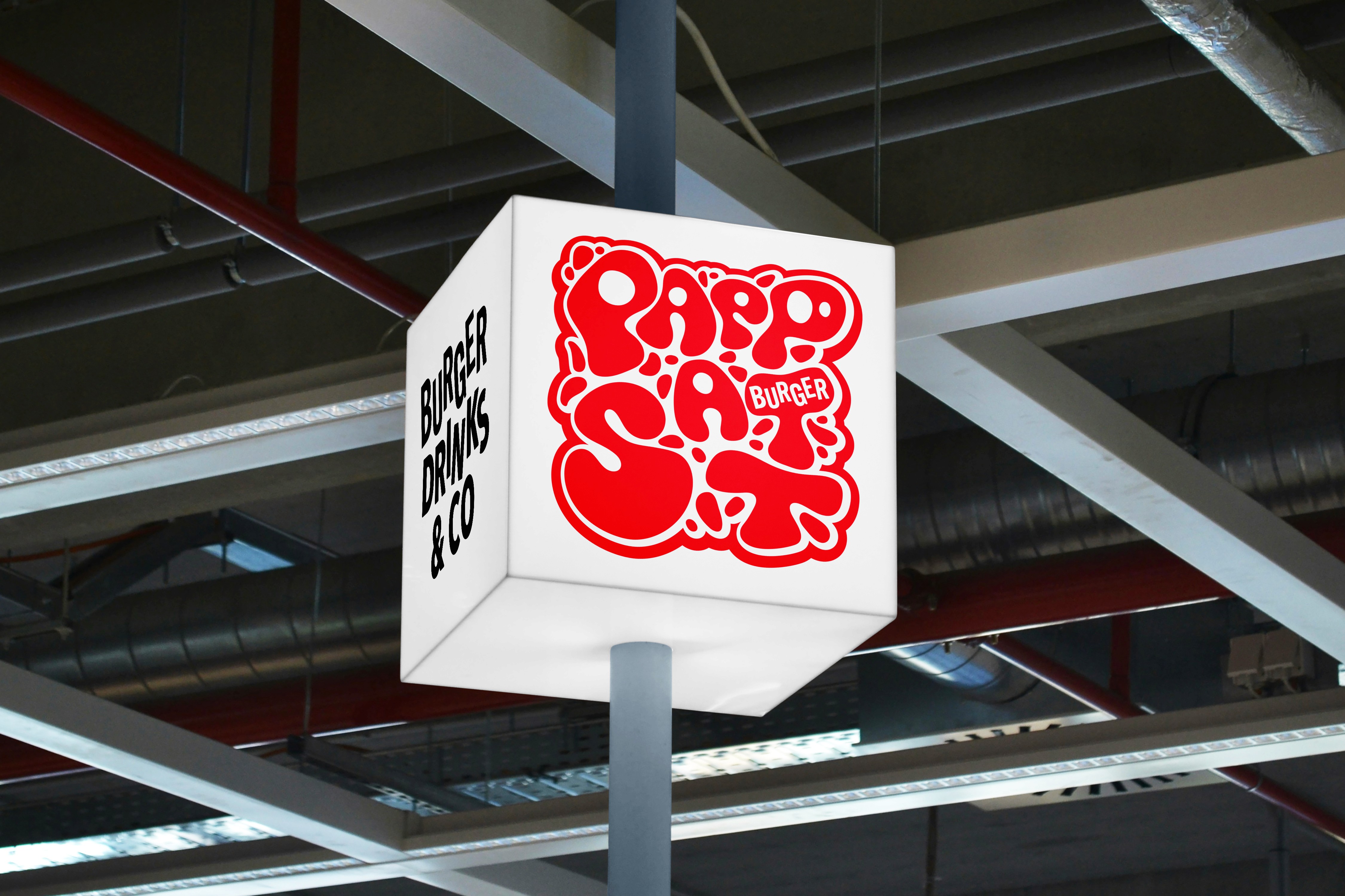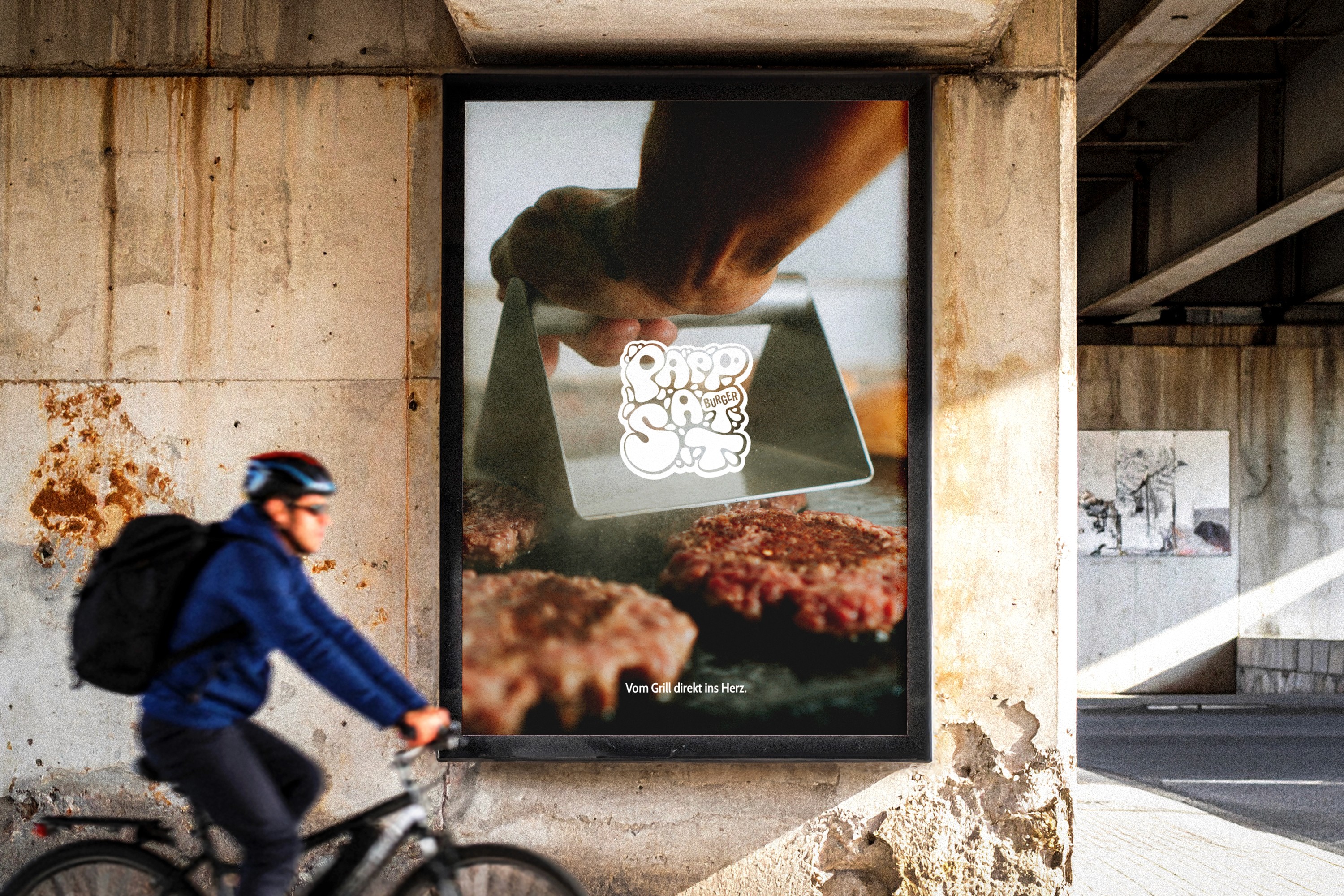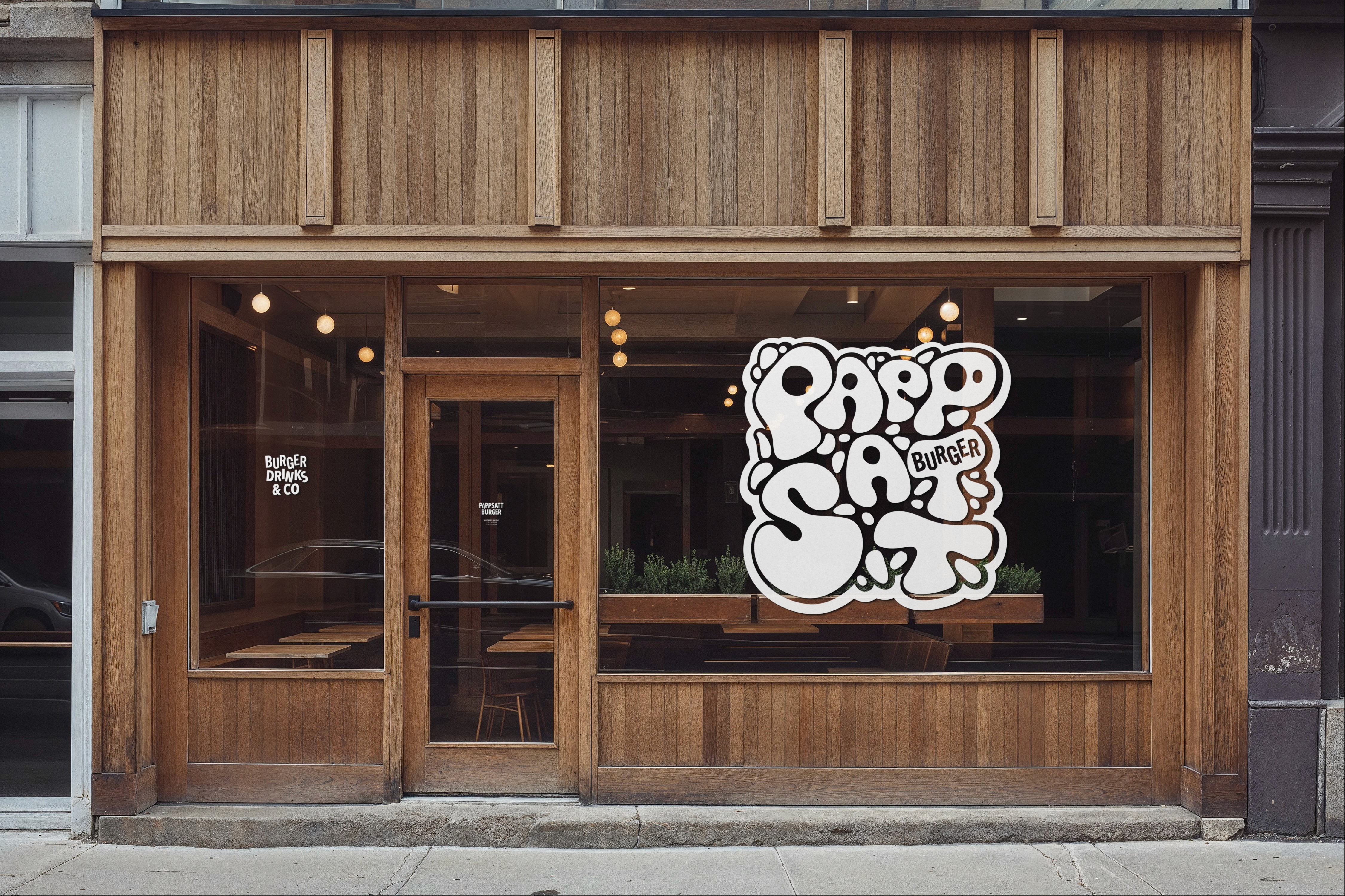 Für den Burger Store Pappsatt wurde eine eigenständige visuelle Identität entwickelt, die den urbanen und jungen Charakter des Restaurants widerspiegelt. Das handgezeichnete Logo im Street-Art-Stil sorgt für einen auffälligen und wiedererkennbaren Auftritt und lässt sich flexibel auf Anwendungen wie Ladenbeschriftung, Verpackungen und Werbemittel übertragen.